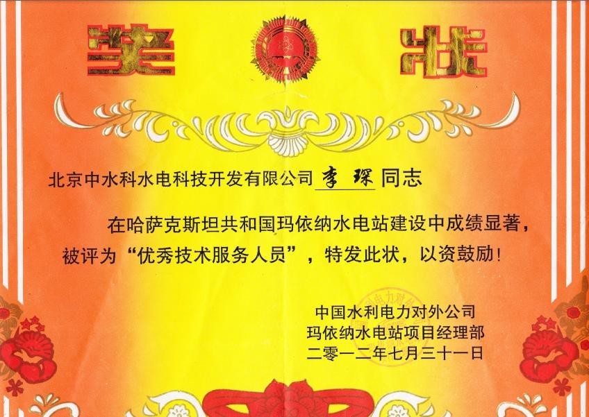 马依纳电站“优秀技术服务人员”证书(李琛)