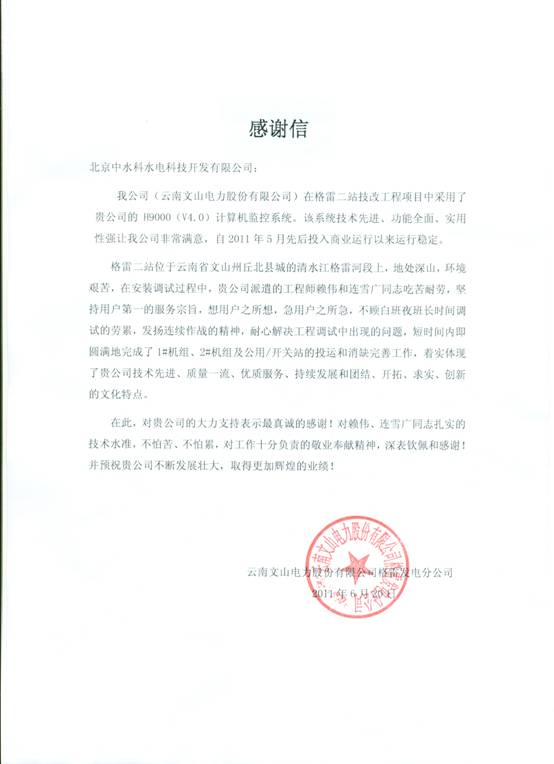该项目前后共历时2个多月,中水科技的现场调试工程师克服时间短、任务重、环境艰苦等困难,全力以赴,保质、保量完成了各项调试试验任务,确保了机组的按时顺利投运。用户特发来感谢信,表扬赖伟、连雪广同志的敬业精神和技术水平,称赞中水科技公司的企业文化。