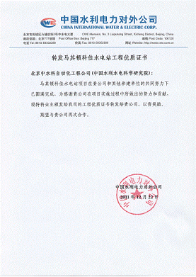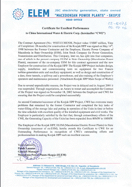 马其顿科佳(KOZJAK)水电站由三峡集团公司属下中国水利电力对外公司总承包实施,中水科技为该电站提供了全厂计算机监视控制系统。该工程近日获得了业主单位马其顿国家电力公司(ELEM)颁发的工程优质证书。