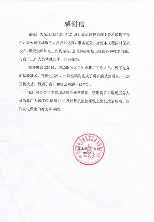 2012年3月7日与5月5日,中水科技顺利完成湖南大、小东江电站首台机组的监控系统改造,H9000计算机监控系统顺利投运,两电站首台机组成功并网发电。