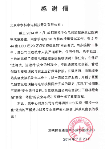 在长达3年的现场系统投运过程中,中水科技的工程师们以严谨科学的工作态度,细致扎实的工作作风,在“边施工、边安装、边调试、边运营”的复杂环境中,不断技术创新,管理创新,圆满完成了高强度的接机任务,创造了巨型机组电站群远程“调控一体化”与电站接机发电同步实施的历史,创造了全过程无一例责任事故、安全事故和软硬件差错的历史,实现了系统“无缺陷、长周期、不间断”的目标。为此,三峡梯调通信中心成都调控中心特发感谢信。