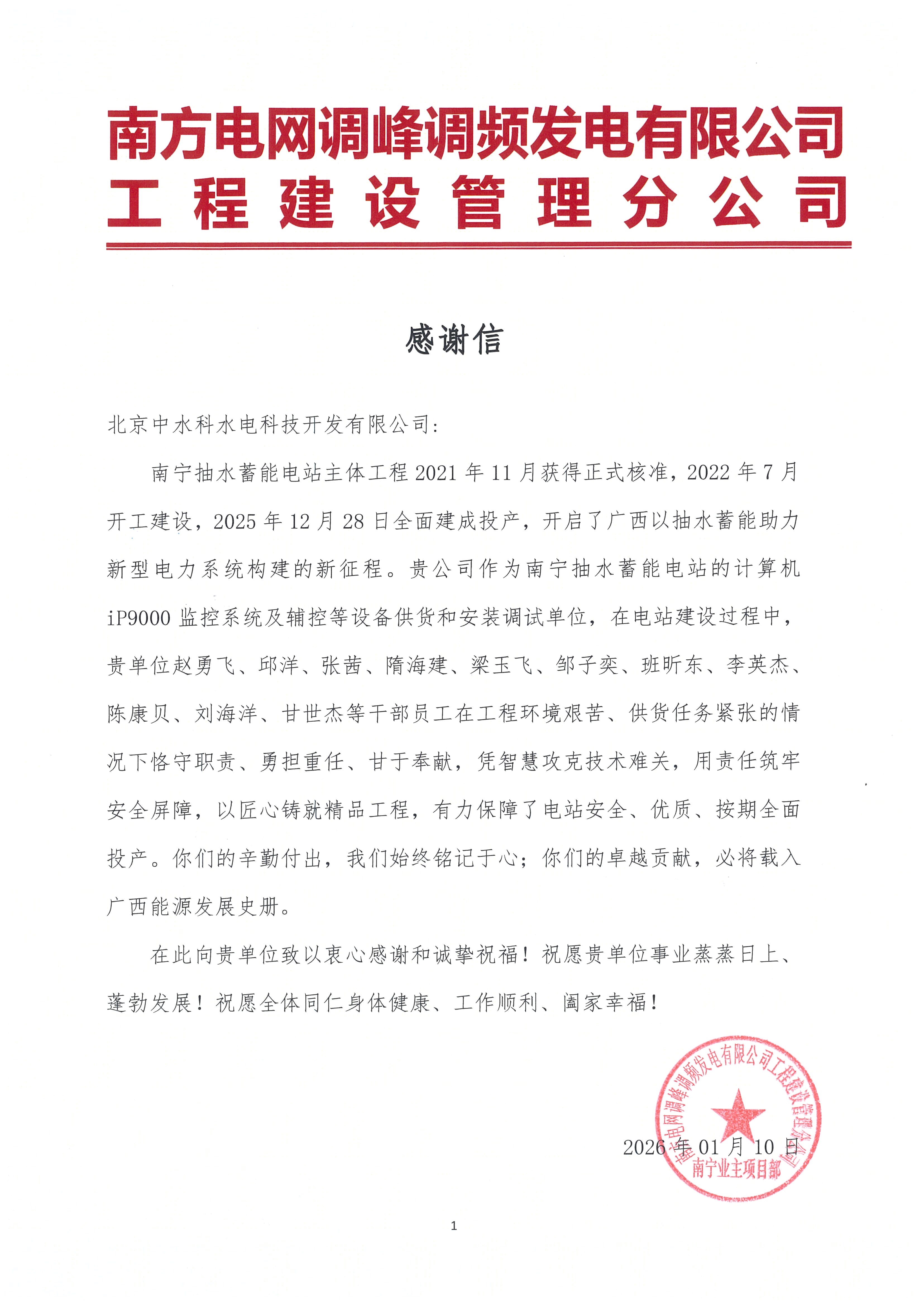 感谢信-南方电网调峰调频发电有限公司工程建设管理分公司